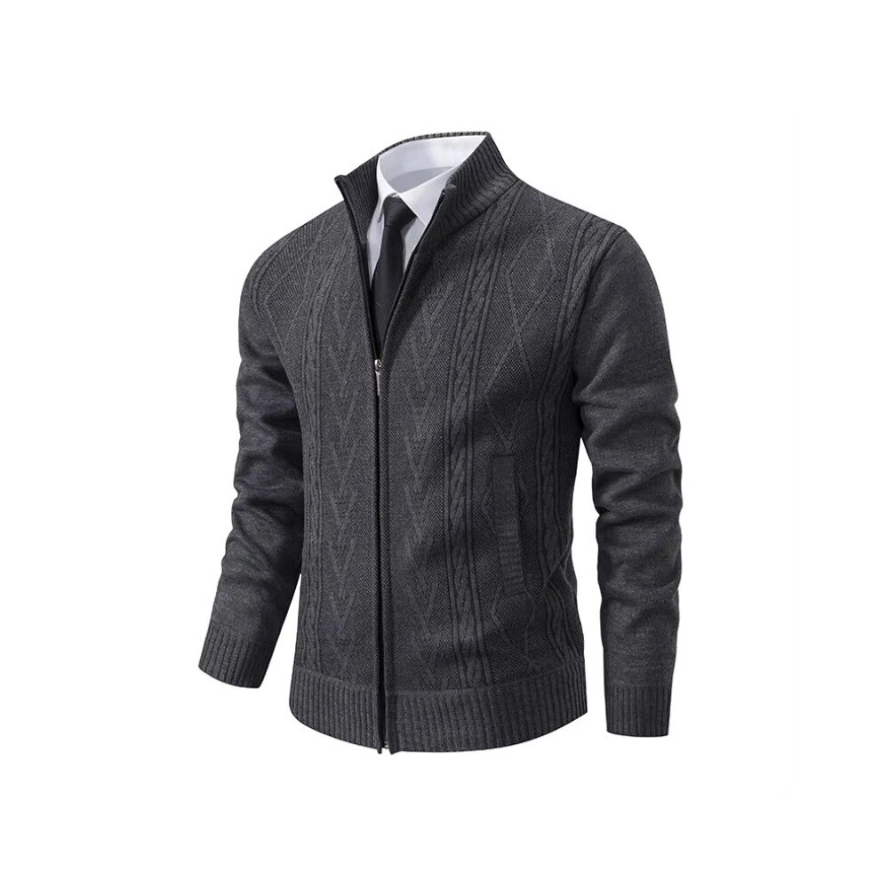 (UK L=TAG XL, Dark Grey) Mens Fleece Lined Cable Knitted Zip Up Cardigan Warm Winter Outerwear Jumper