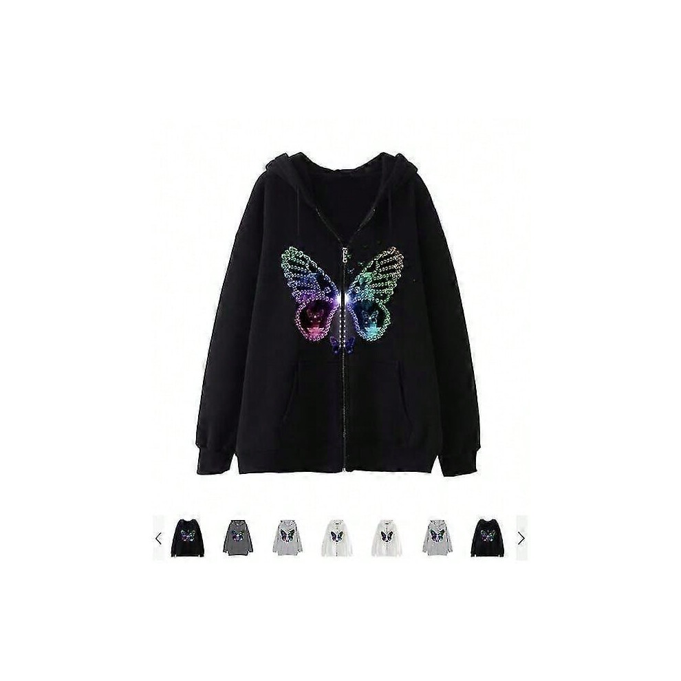 (L, dark grey) Hoodie Gothic Sequin Butterfly Print Hoodie Trendy Casual Zip Cardigan Jacket Sweatshirt Top