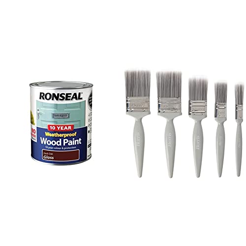 Ronseal 10 Year Weatherproof 2-in-1 Wood Paint Dark Oak Gloss 750ml and Harris Essentials Walls & Ceilings Paint Brush Set | Pack of 5 | 0.5", 1", 1.5", 2"