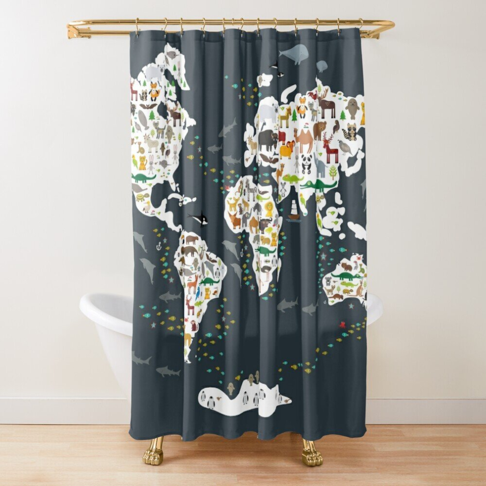 Shower Curtains Cartoon animal world map, back to schhool. Animals from all over the world, dark grey. Scandinavian for Bathroom Decor 72x72 inches