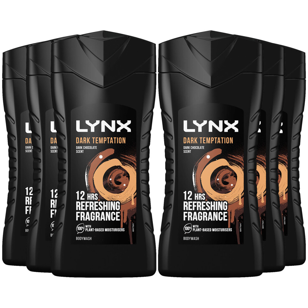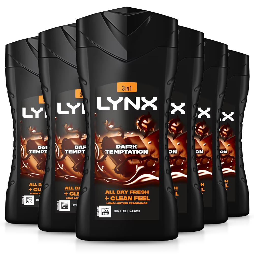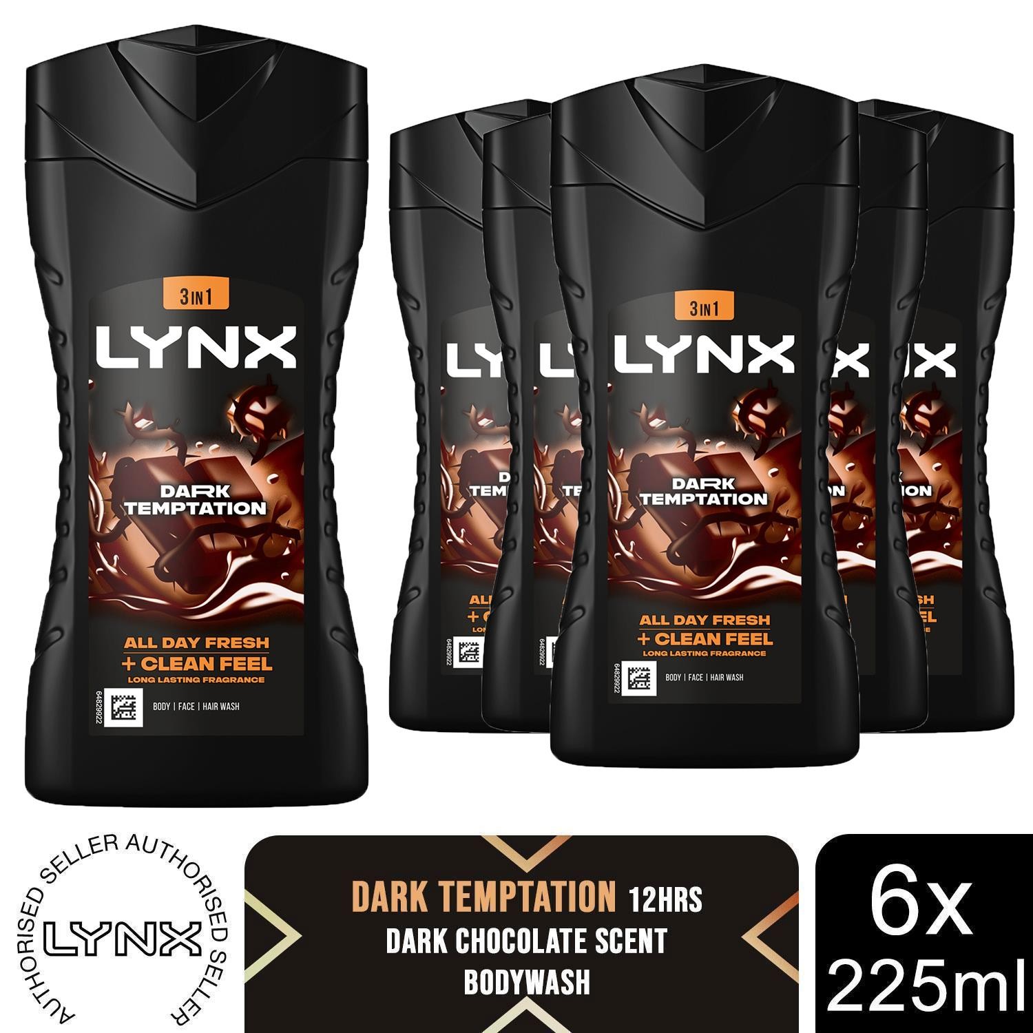 Lynx Men Dark Temptation 3-in-1 Body Wash Shower Gel with an intense scent of rich chocolate for an all day fresh & clean feel 225 ml, Pack of 6