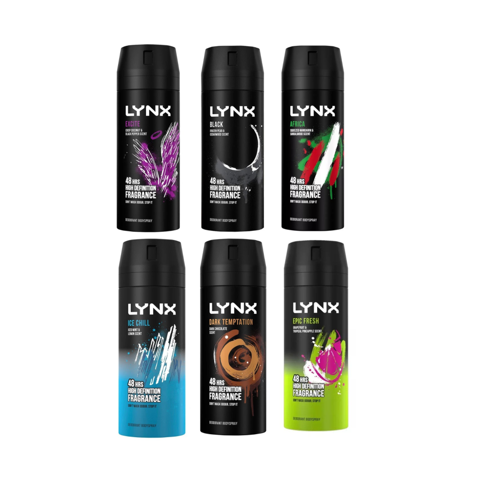 6 x 150ml Lynx MIX Deodorant Body Spray Africa, Dark Temptation Ice Chill Excite