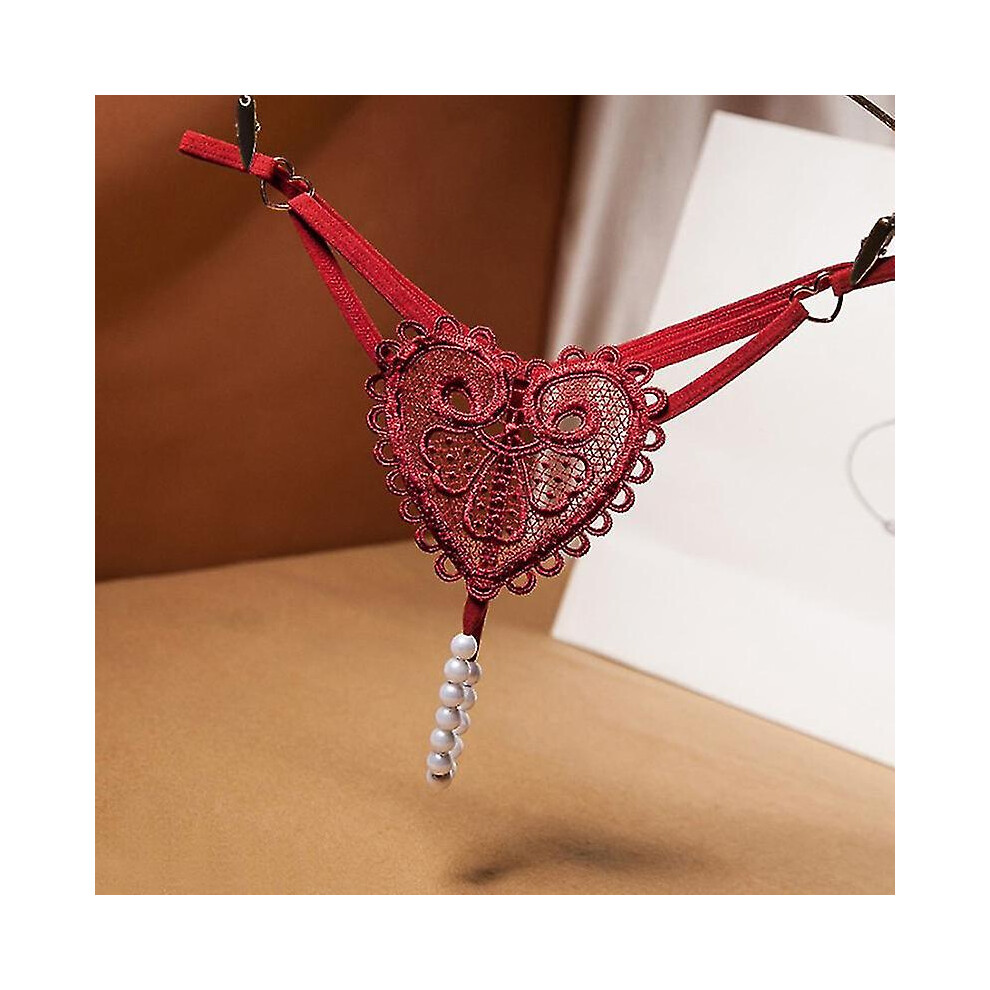 (Dark red) New Pearls Love Embellishment Thong Embroidery Panries Women's Sexy Ultra-thin G-string Low-waist Beaded Temptation Underwear