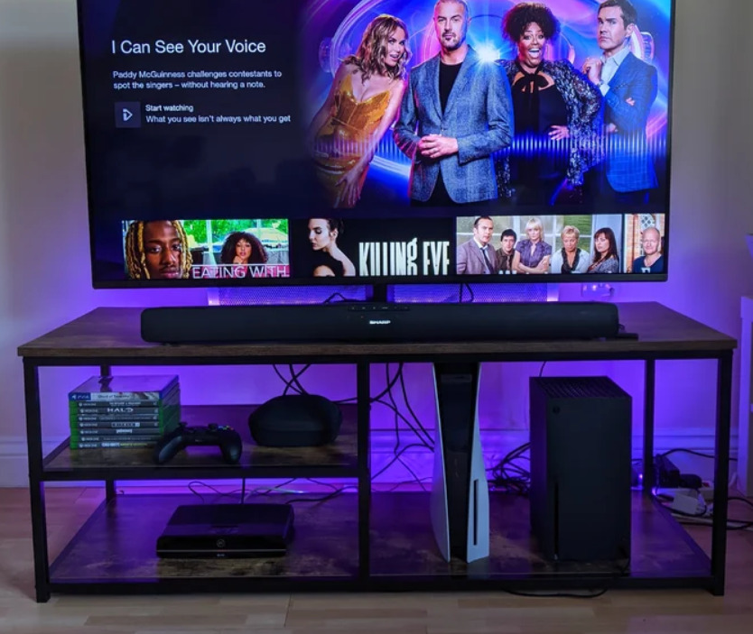 Large TV Unit Rustic Wood Cabinet Led Lights Industrial Media Stand Glass Shelf