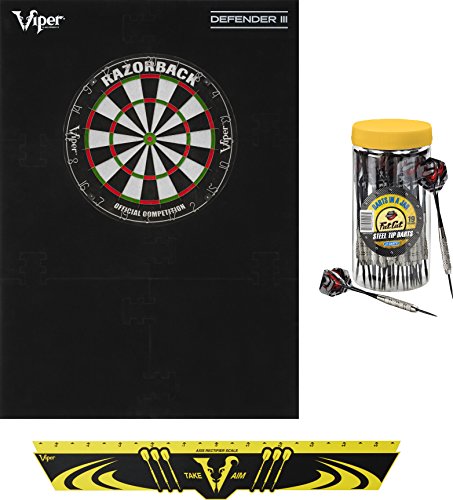 Viper Defender III Backboard & Sisal/Bristle Steel Tip Dartboard Bundle: Elite Set (Razorback Dartboard,Defender III Backboard, Edge Throw Line, 21pc Jar of Darts),black/yellow