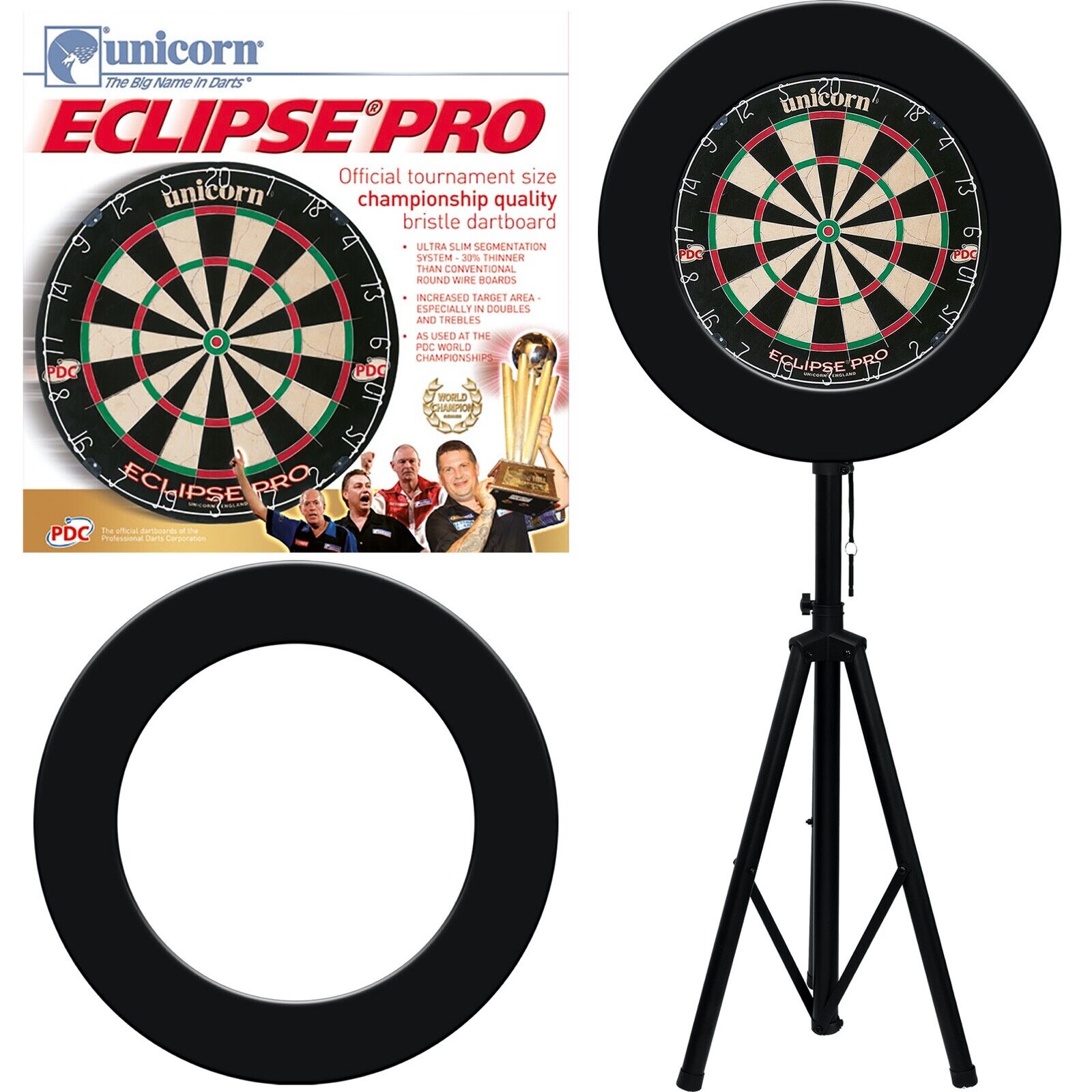 Darts Travel Stand Tripod Board Holder + Unicorn Eclipse Dartboard + Surround