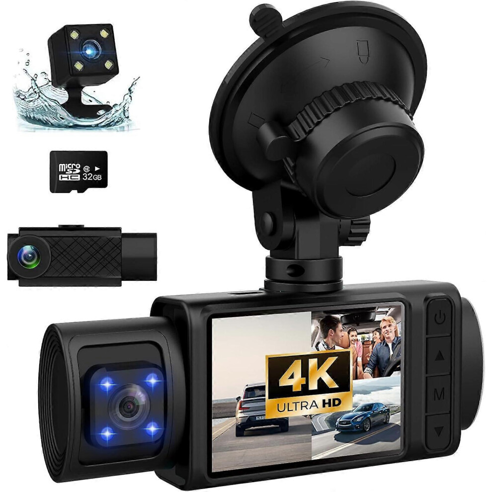 Dash Cam, 3 Channel Dash Cam, 4K+1080P Dash Cam Front and Inside, Triple Dash Cam for Car, Dash Camera with 32GB Card, 2160P Full UHD, G-Sensor, 170D