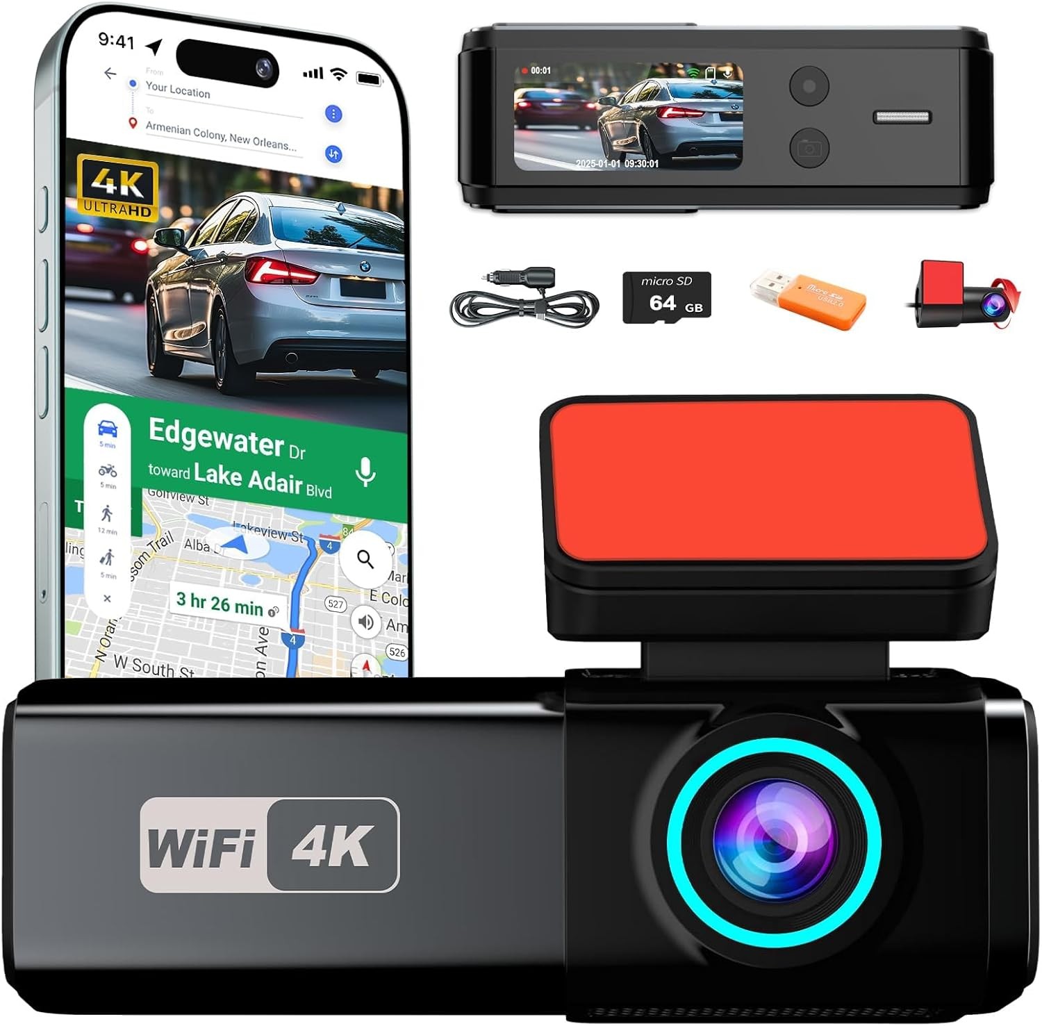 Dash Cam Front and Rear 4K+1080P, UHD Built-in WiFi DashCam with 64GB SD Card Inserted, 170°+140° Wider Angle Dash Camera for Cars, Super Night Vision, 24H Parking Mode, G-Sensor, Loop Recording, WDR