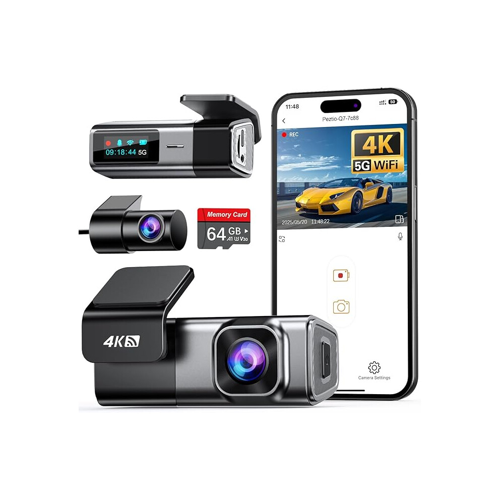 4K Dash Cam Front and Rear with 64GB Card, Built-in 5G WiFi, Dash Camera for Cars 4K Front and 1080P Rear, Dashcams for Cars Loop Recording