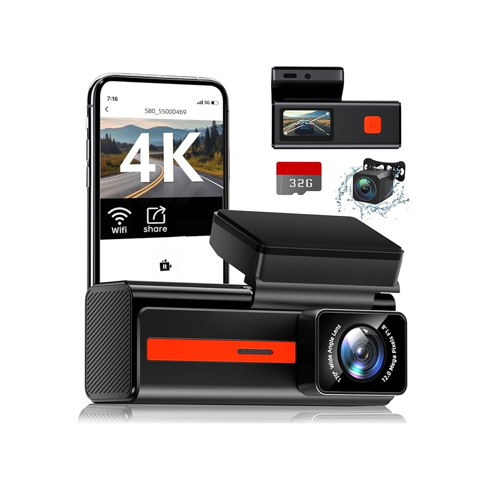 4K Dash Cam Front and Rear, Ultra HD Dual Dash Camera for Car with Free 32GB SD Card Built-in WiFi, 170°Wide Angle, 24/7 Parking Mode