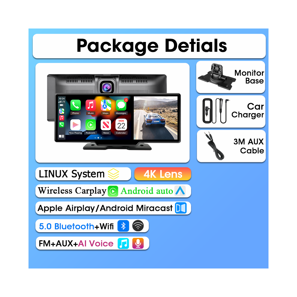 10.26" Touchscreen Portable Car Stereo with HD 4K Dashboard Cam