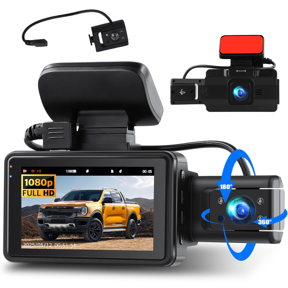 3 Channel Dash Cam Front and Rear Inside,Full HD 1080P Dash Cam for Cars with Super Night Vision Loop Recording G-Sensor APP Control 150Wide Angle 3.