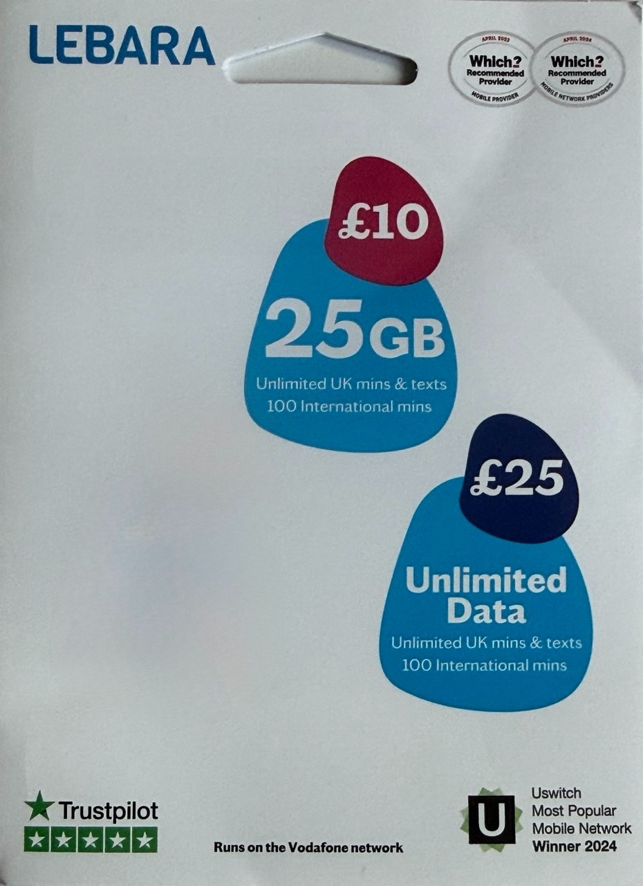 Lebara UK Unlimited Data SIM Card, Unlimited UK Minutes & Texts, 100 Internation