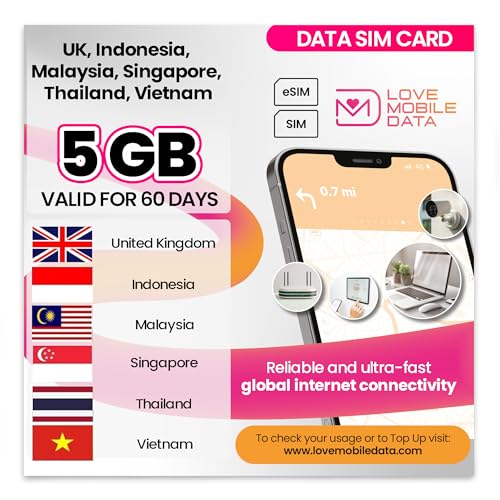 Love Mobile Data Only Sim Card - International Multi-Network 4G/5G Prepaid Pay As You Go Data Sim for Mobile, Routers etc, UK, Indonesia, Malaysia, Singapore, Thailand, Vietnam - 5GB - 60 Days