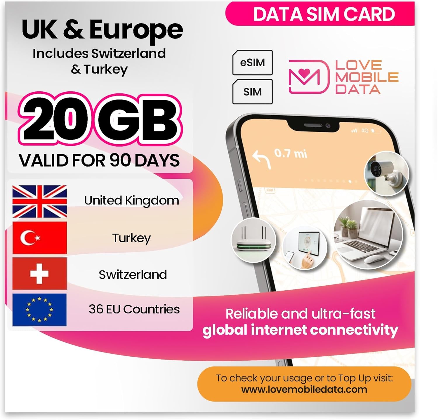 Love Mobile Data Only Sim Card 20GB for 3 Months UK Europe Switzerland Turkey