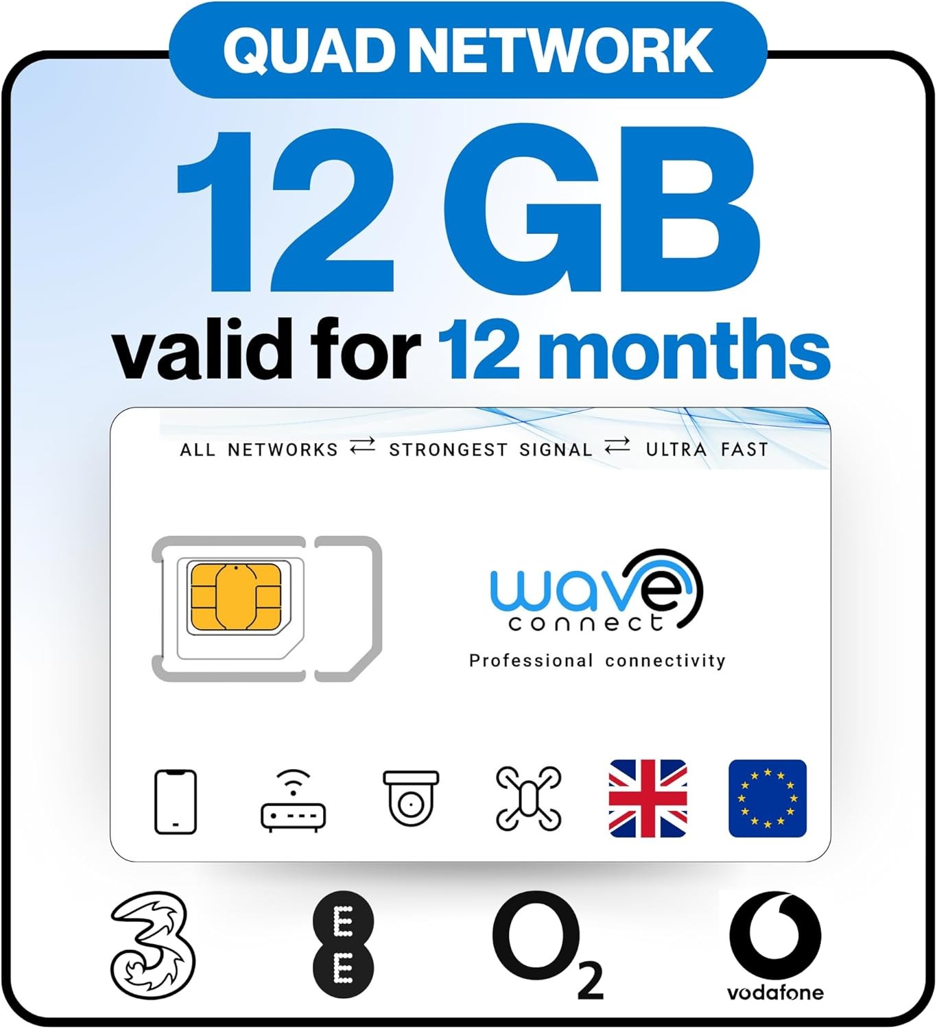 Wave Connect Quad Network Data Only SIM Card, Three, EE, O2, Vodafone, 4G LTE + 5G Prepaid, Activates On First Use, Includes UK, Ireland, EU, For Unl