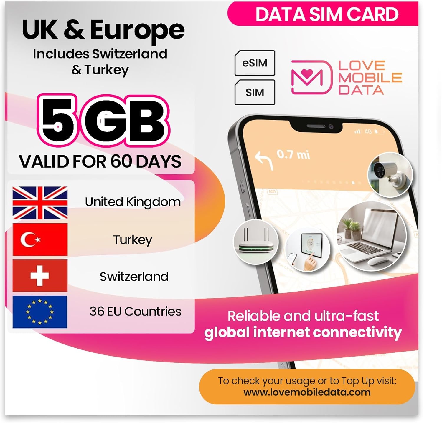 Love Mobile Data Only SIM Card 5GB 60 Days UK Europe Switzerland Turkey 4G/5G