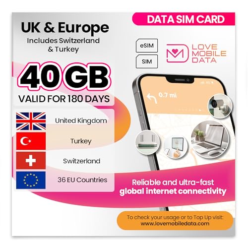 Love Mobile Data Only Sim Card - International Multi-Network 4G/5G Prepaid Pay As You Go Data Sim for Mobile Phones, WiFi Routers, & More, Europe, UK, Switzerland & Turkey - 40GB for 180 Days