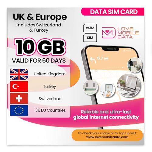 Love Mobile Data Only Sim Card - International Multi-Network 4G/5G Prepaid Pay As You Go Data Sim for Mobile Phones, WiFi Routers, & More, Europe, UK, Switzerland & Turkey - 10GB for 60 Days