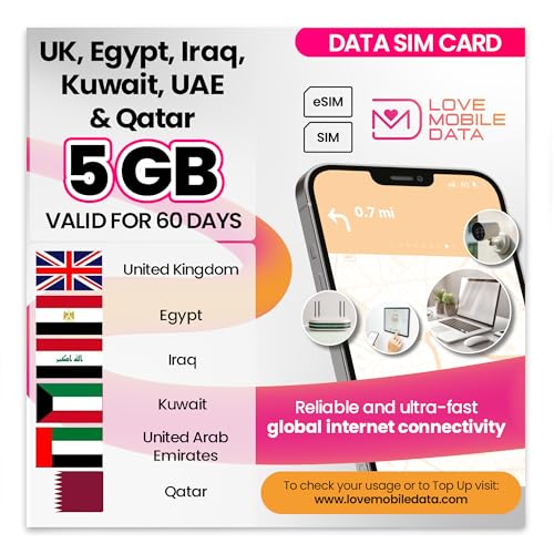 Love Mobile Data Only Sim Card - International Multi-Network 4G/5G Prepaid Pay As You Go Data Sim for Mobile Phones, WiFi Routers & More, UK, Egypt, Iraq, Kuwait, Qatar & UAE - 5GB for 60 Days