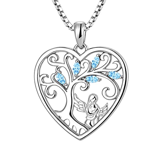 FJ Heart Guardian Angel Mother Daughter Necklace 925 Sterling Silver Tree of Life Pendant Necklace with March Birthstone Aquamarine Jewellery Gifts for Mother Daughter