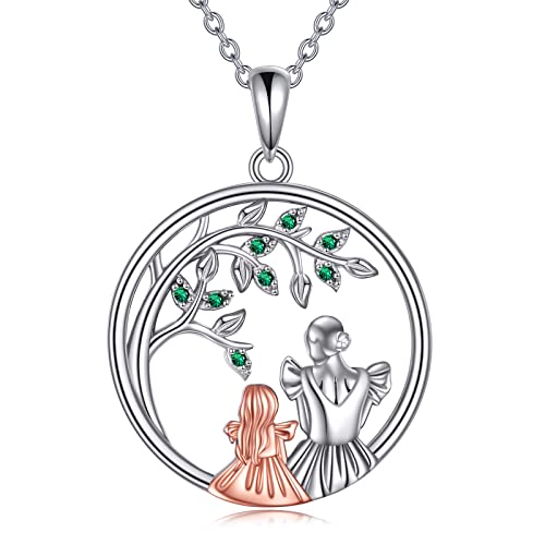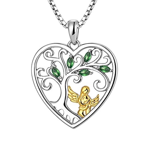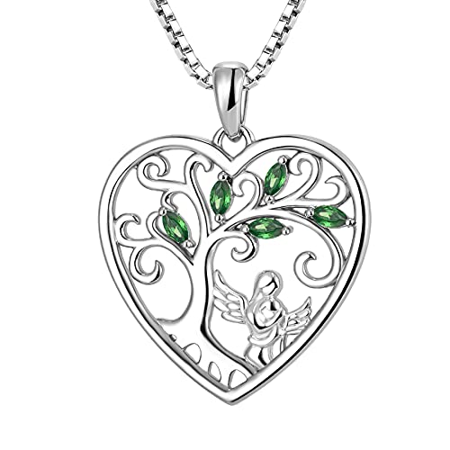 FJ Heart Guardian Angel Mother Daughter Necklace 925 Sterling Silver Tree of Life Pendant Necklace with May Birthstone Emerald Jewellery Gifts for Mother Daughter
