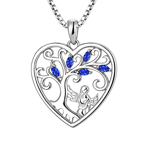 FJ Heart Guardian Angel Mother Daughter Necklace 925 Sterling Silver Tree of Life Pendant Necklace with September Birthstone Sapphire Jewellery Gifts for Mother Daughter