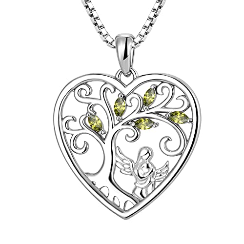 FJ Heart Guardian Angel Mother Daughter Necklace 925 Sterling Silver Tree of Life Pendant Necklace with August Birthstone Peridot Jewellery Gifts for Mother Daughter