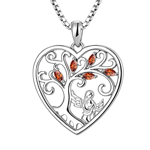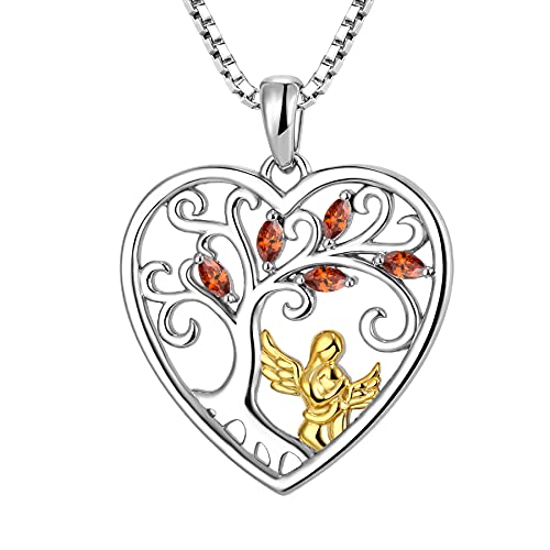 FJ Heart Guardian Angel Mother Daughter Necklace 925 Sterling Silver Tree of Life Pendant Necklace with January Birthstone Garnet Jewellery Gifts for Mother Daughter