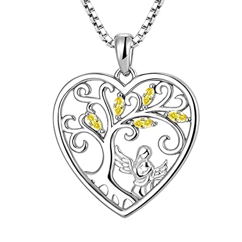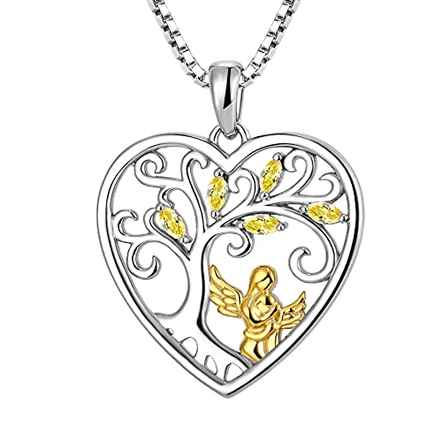 FJ Heart Guardian Angel Mother Daughter Necklace 925 Sterling Silver Tree of Life Pendant Necklace with November Birthstone Citrine Jewellery Gifts for Mother Daughter