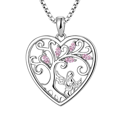 FJ Heart Guardian Angel Mother Daughter Necklace 925 Sterling Silver Tree of Life Pendant Necklace with October Birthstone Pink Tourmaline Jewellery Gifts for Mother Daughter