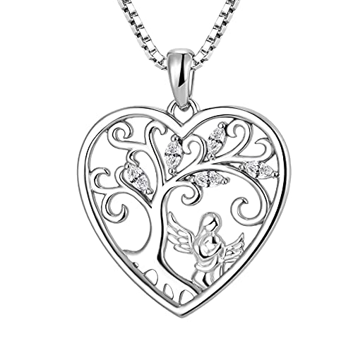 FJ Heart Guardian Angel Mother Daughter Necklace 925 Sterling Silver Tree of Life Pendant Necklace with April Birthstone Cubic Zirconia Jewellery Gifts for Mother Daughter