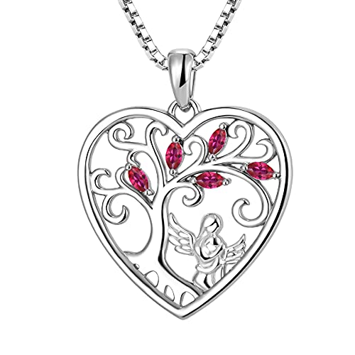 FJ Heart Guardian Angel Mother Daughter Necklace 925 Sterling Silver Tree of Life Pendant Necklace with July Birthstone Ruby Jewellery Gifts for Mother Daughter