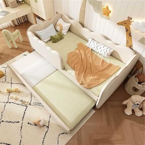 BTM Upholstered Single Daybed, Single Bed with Pull out Trundle, Sofa Bed with Slatted Frame for Adults and Children, 3ft-90x190cm Day Bed, Linen, Beige(No Mattress)
