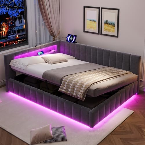 Upholstered Daybed,4ft6 Double Bed Frame with Storage & Smart RGB LED Lights & Charging Station,Hydraulic Gas Lift Ottoman Bed for Adults Kids Teenagers, Velvet Sofa Beds Guest Beds,Grey,No Mattress