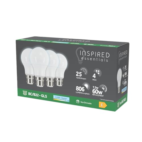 B22 Bayonet LED Bulb, Daylight 6500K, 60W 60 Watts Equivalent, 7.3W B22 GLS Bulbs, Light Bulbs, Last up to 25000 Hours, 806 Lumen, Non-Dimmable, Pack of 4