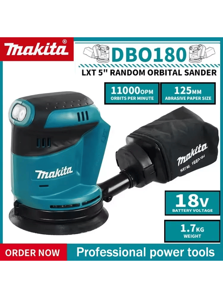 Original Makita DBO180Z Cordless Disc Sander 190W Power 123mm Pad 11000 OPM Low Vibration Compact Design for Wood Sanding