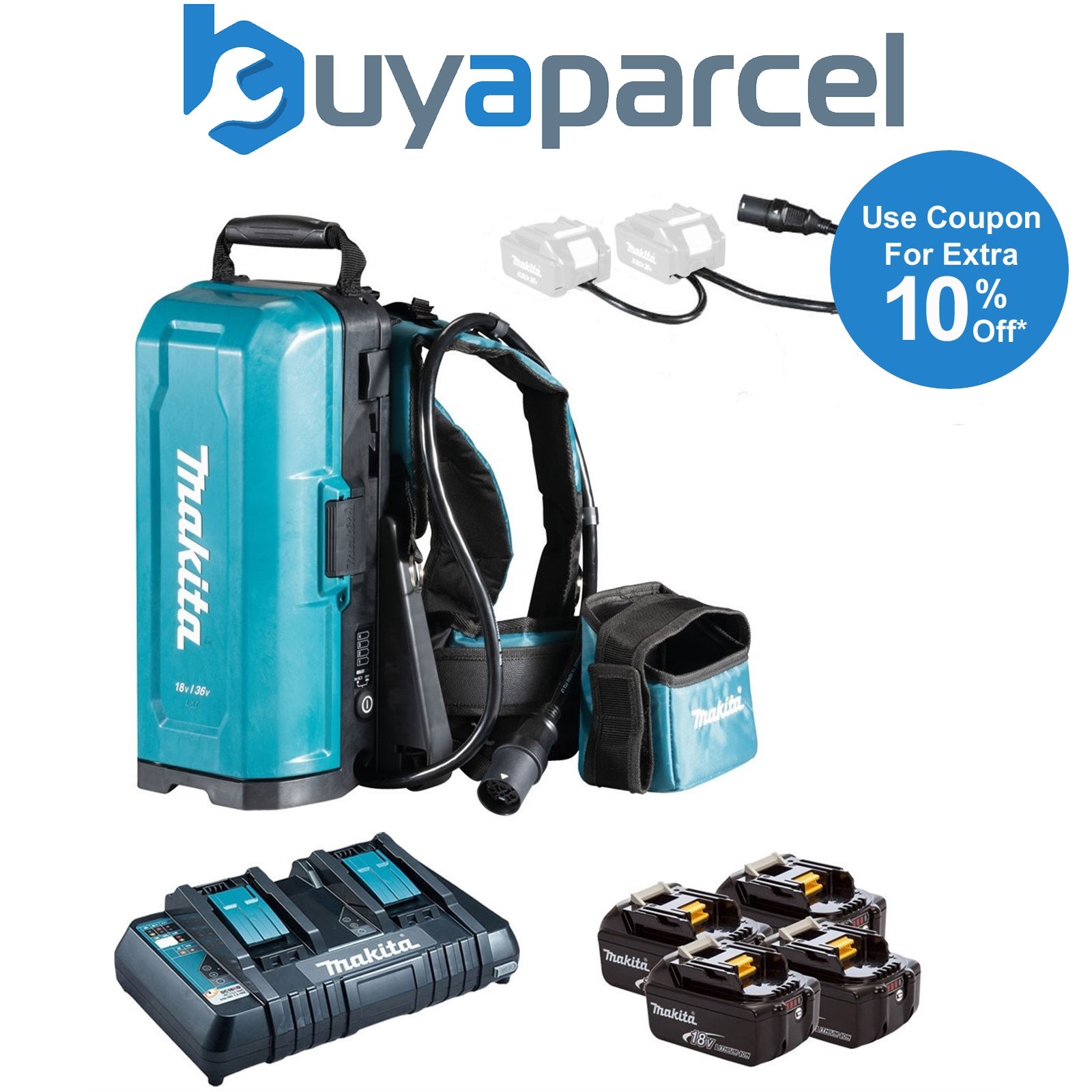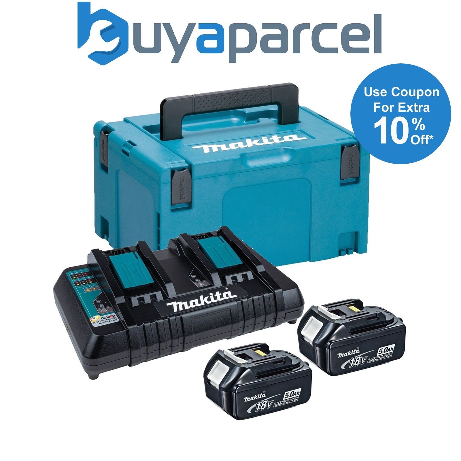 Makita BL1850 18v 4 x 5.0ah Lithium Batteries DC18RD Dual Port Charger + Makpac