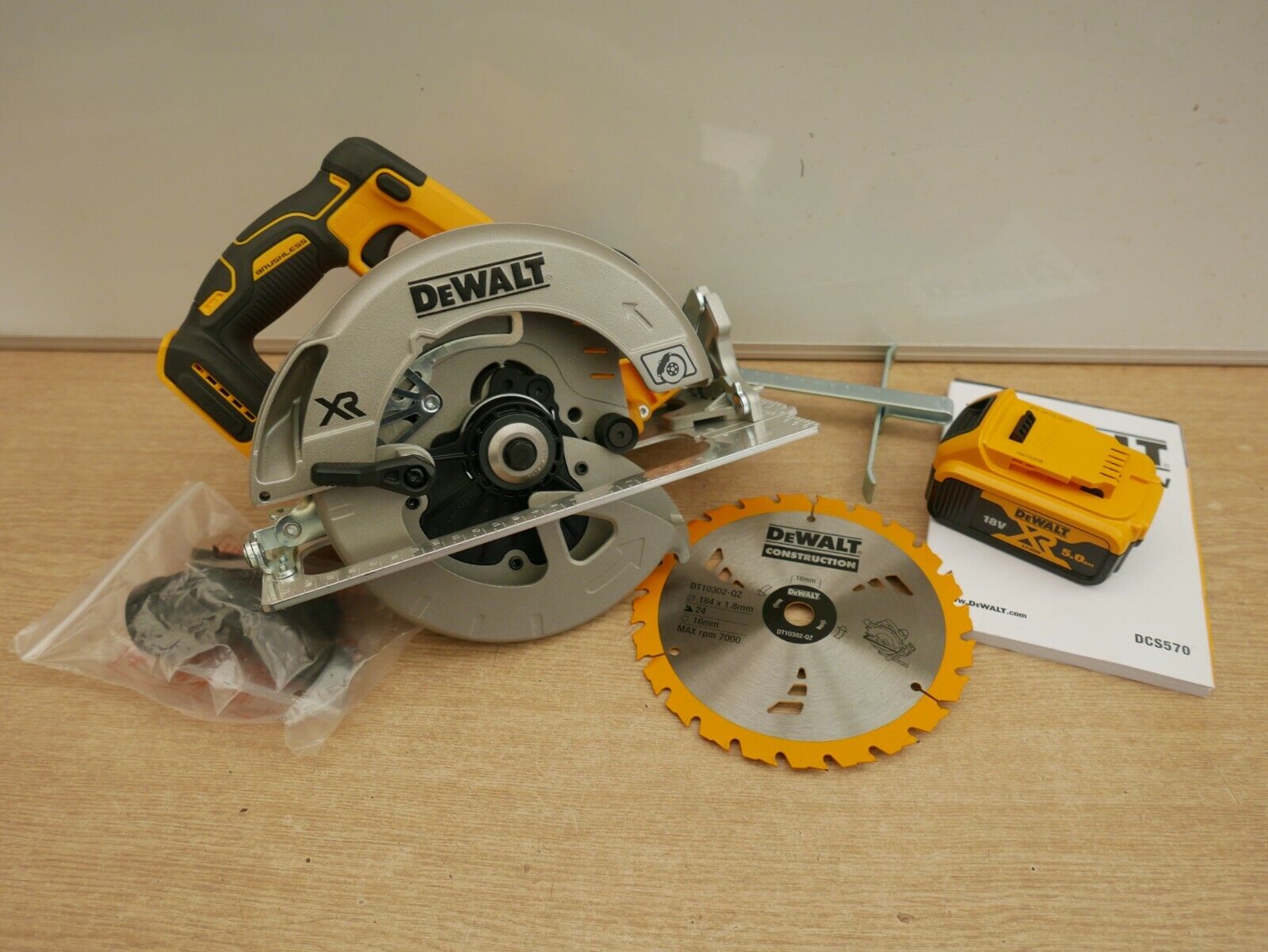 DeWalt DCS570 18V 184mm Circular Saw + Fence Adaptor Bare Unit & DCB184 5AH