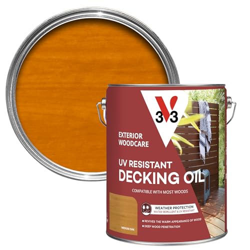 V33 UV Resistant Decking Oil - Protects & Revives - Enhanced UV Filters - Water-Repellent - Medium Oak 5 litres