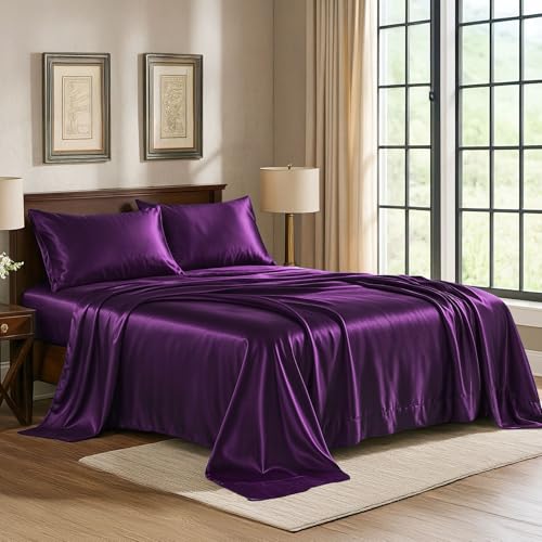 Pure Bedding 4 Piece Satin Fitted Sheets Purple Luxury Stain Resistant - Deep Pocket Fitted Sheet, Flat Sheet and Pillowcases