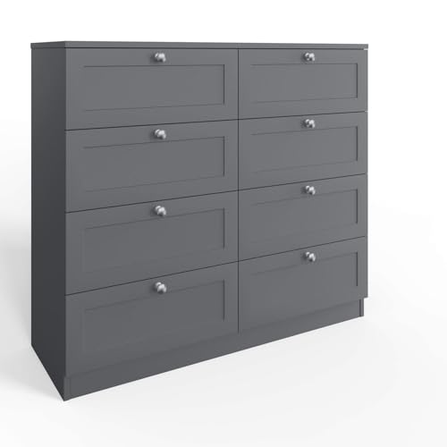 FWStyle Matt Grey 8 Drawer Chest of Drawers, Shaker Style Bedroom Storage Unit with Chrome Knob Handles, Large Wooden Chest with Deep Drawers H99 x W110 x D40cm
