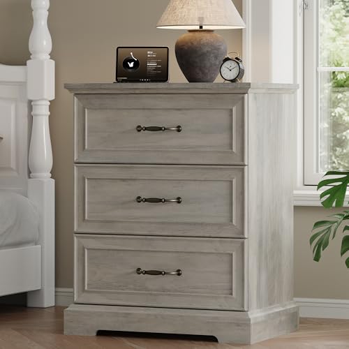 Farmhouse 3 Drawers Dresser for Bedroom, 24" Wide Modern Chest of Drawers with Deep Drawers & Bar Handles, Rustic Wood Nightstand, Wooden Closet Storage Organizer for Living Room, Hallway, Grey