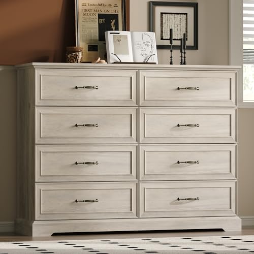 Farmhouse 8 Drawers Dresser for Bedroom, 54" Wide Modern Chest of Drawers with Deep Drawers & Bar Handles, Rustic Wood Dresser TV Stand, Wooden Closet Storage Organizer for Living Room, Hallway, Grey