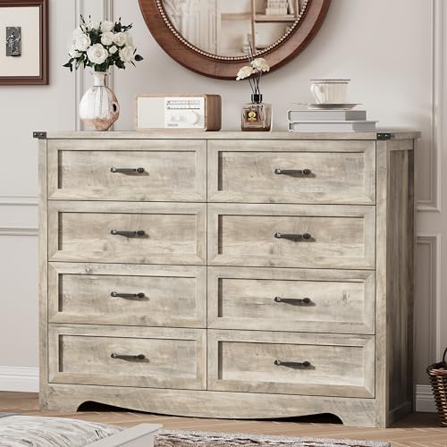 Farmhouse 8 Drawers Dresser for Bedroom, 48" Wide Modern Chest of Drawers with Deep Drawers & Bar Handles, Rustic Wood Dresser TV Stand, Wooden Closet Storage Organizer for Living Room, Hallway, Grey