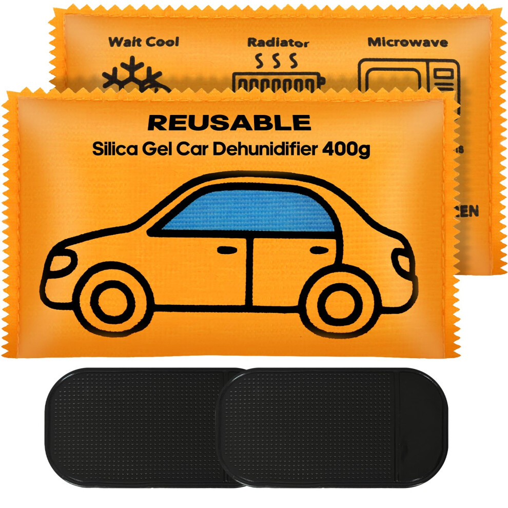 Flow fire 2 Pack x 400g Reusable Dehumidifier Bags for Car, Silica Gel Car Moisture Absorber with Anti Slip Pad, Condensation Bags for House, Windows