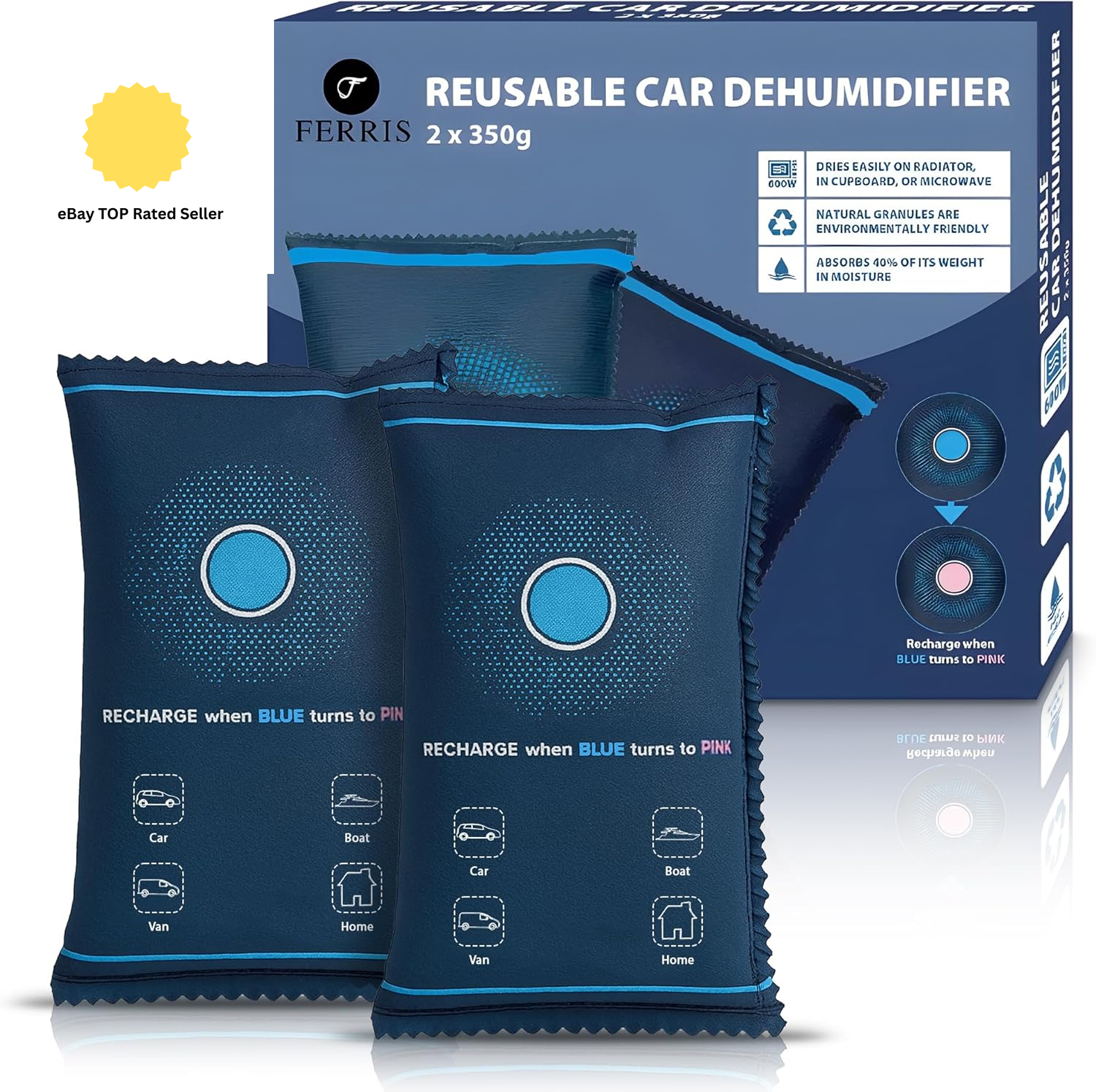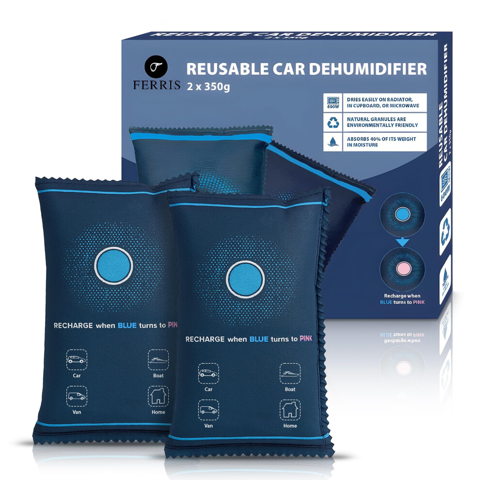 FERRIS | 2 X 350g Car Dehumidifier Bags | Reusable & Safe Interior Dehumidifiers for Home & Moisture Absorber Sachets | Microwave Reactivated, Leakpr