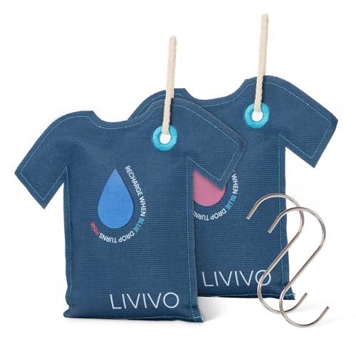 LIVIVO T-Shirt Shaped Hanging Dehumidifier Bags 200g – 2 Pack Reusable Silica Gel Moisture Absorbers with Colour Indicator - Damp Remover for Wardrobe, Home, Cupboards, Car & Caravan