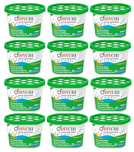 DIVCHI Disposable Dehumidifier for Home 500ml, Pack of 12 Moisture Absorber Dehumidifiers for Damp, Mould, Kitchen, Wardrobe, Bedroom, Caravan, Office, Garage, Bathroom - Mini Condensation Absorbers