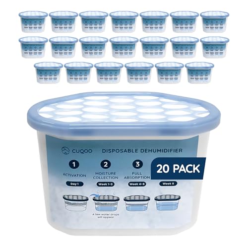 CUQOO Disposable Dehumidifier for Home 500ml, Pack of 20 Moisture Absorber Dehumidifiers for Damp, Mould, Kitchen, Wardrobe, Bedroom, Caravan, Office, Garage, Bathroom - Mini Condensation Absorbers